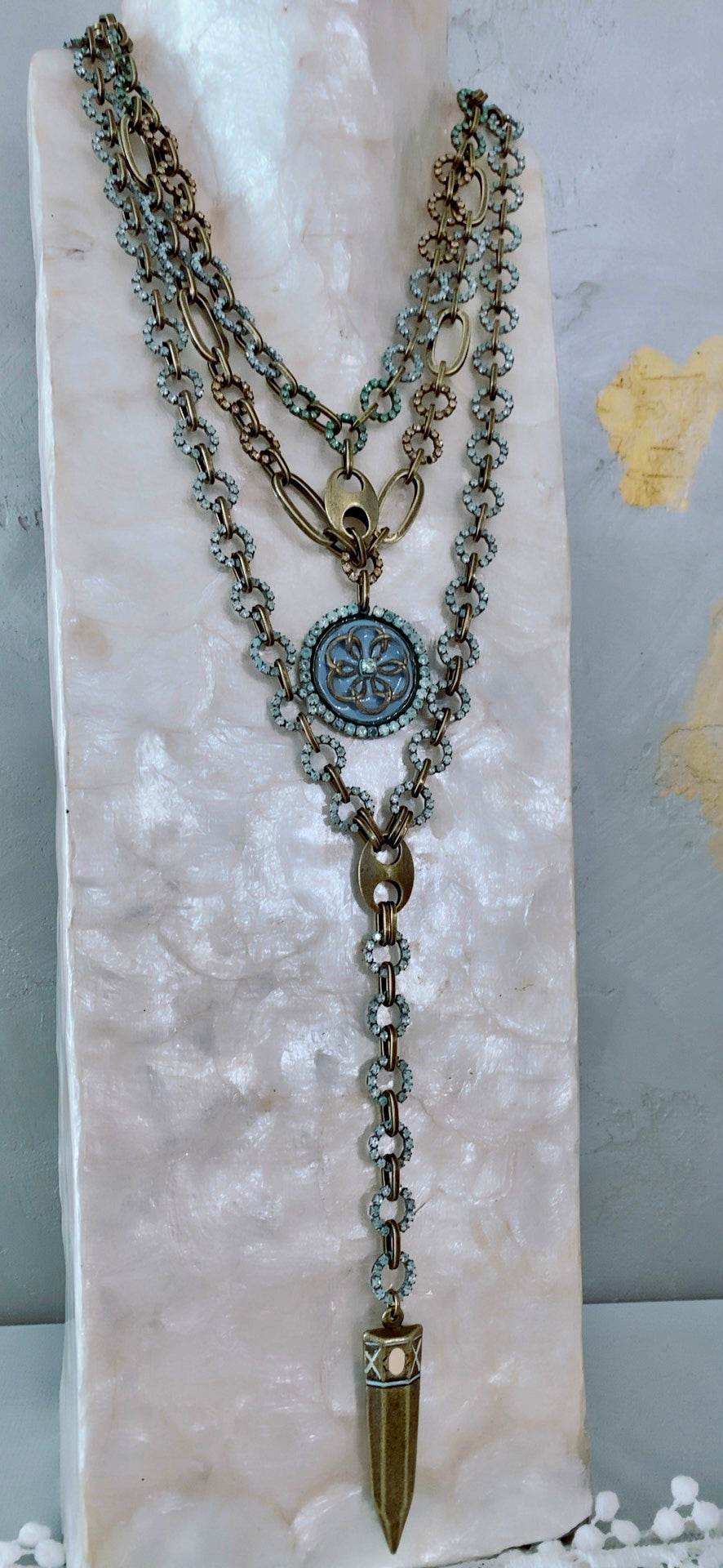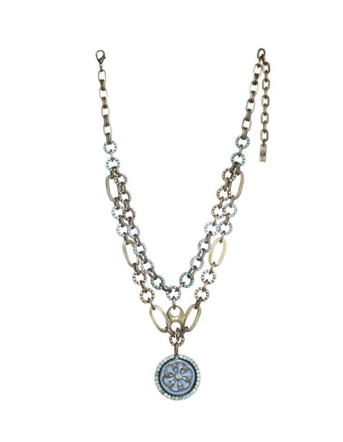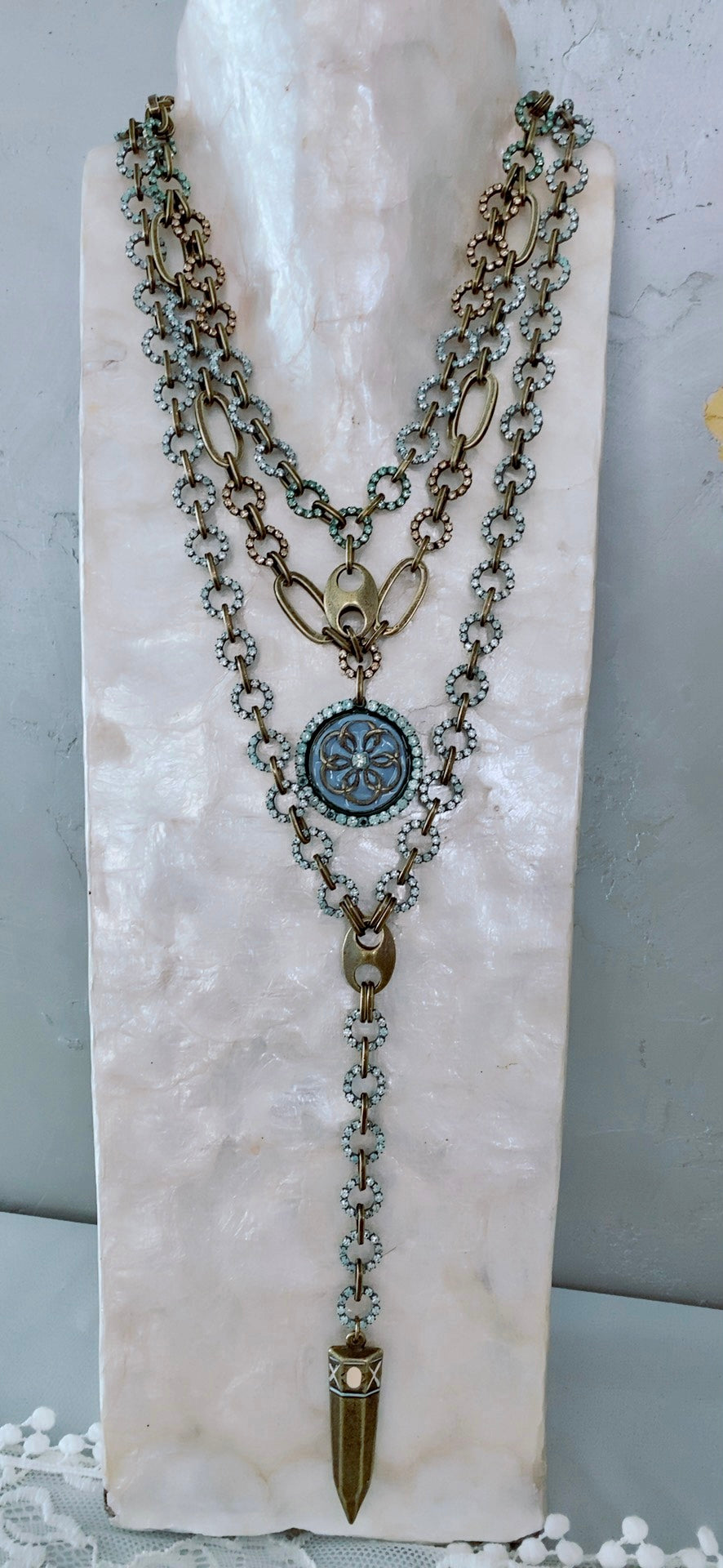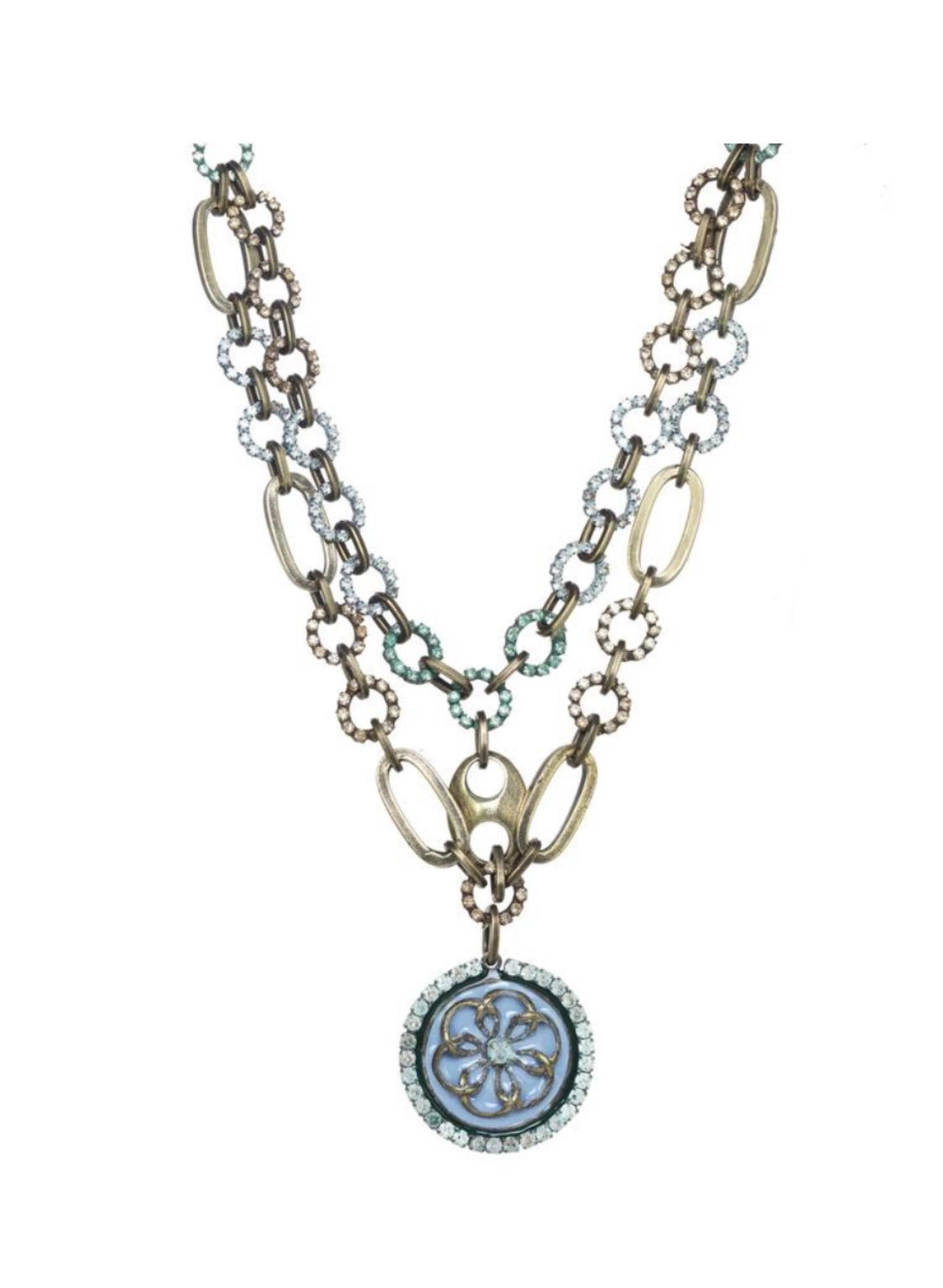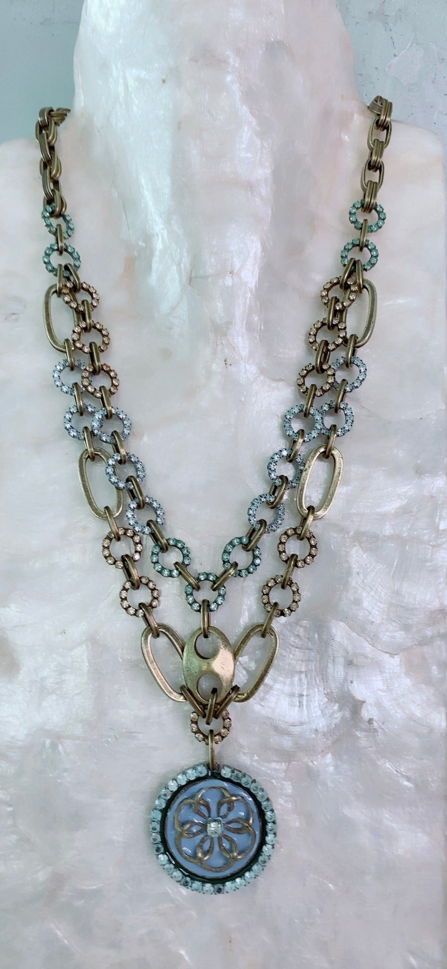 Doble collar vintage en Brass, Swarovski y charm en flor esmaltada.
