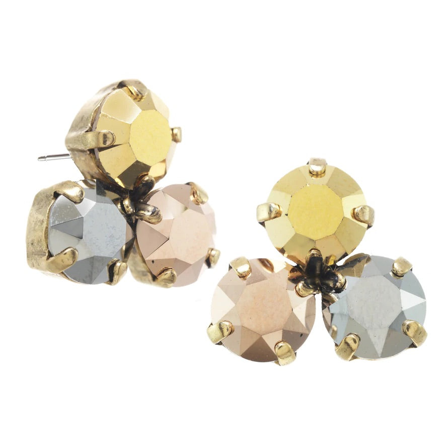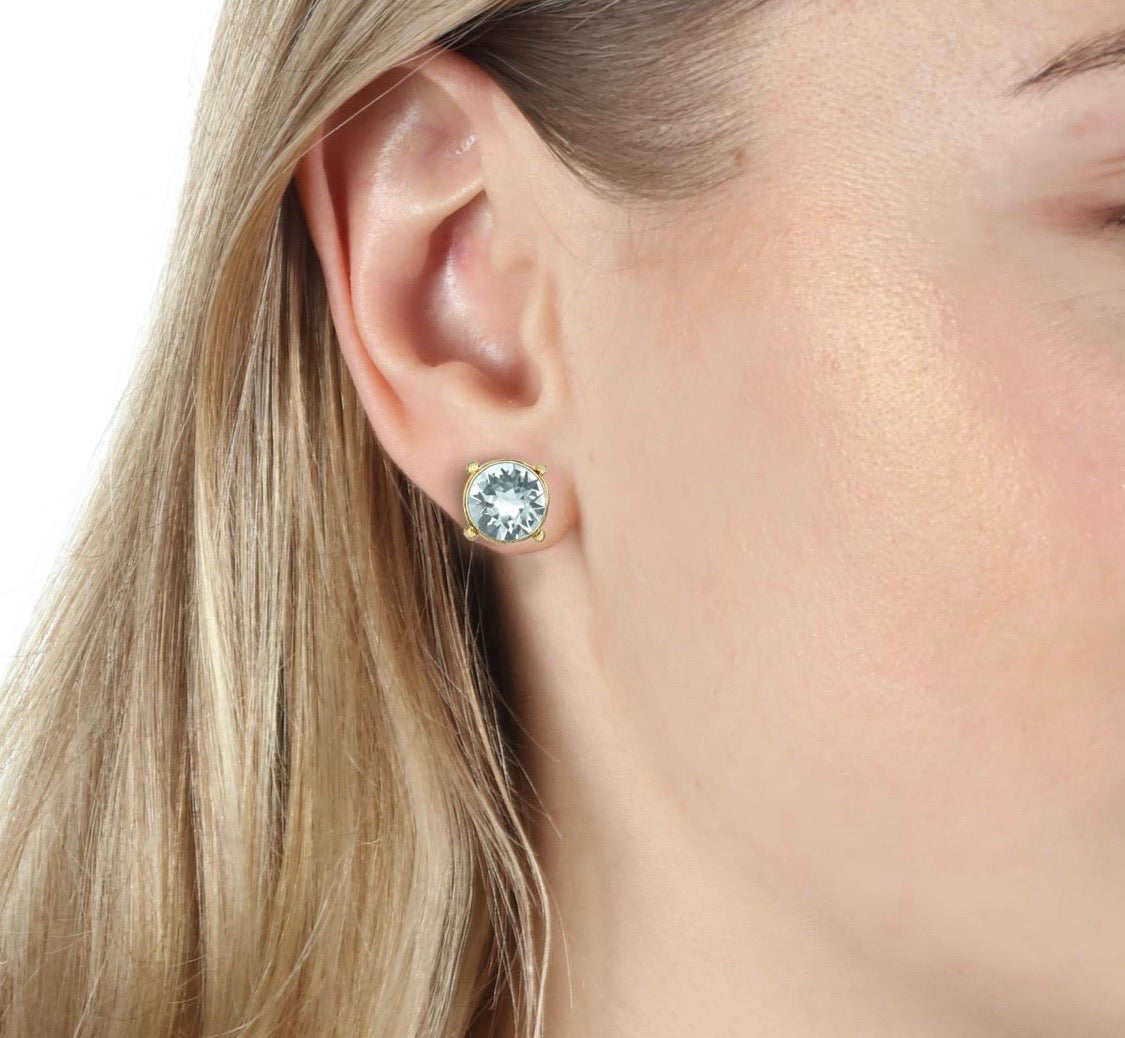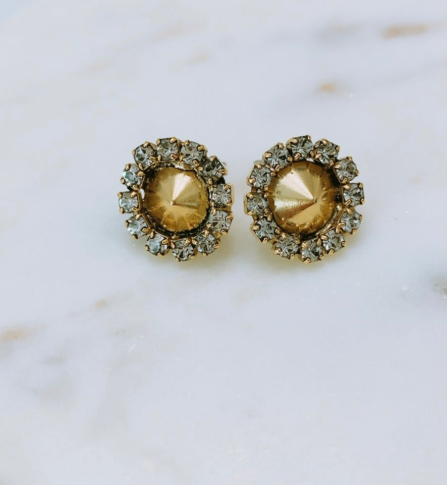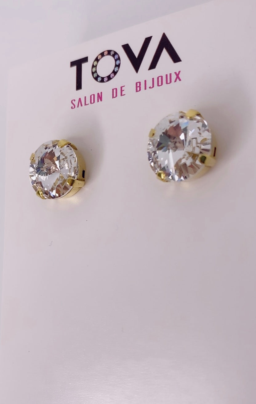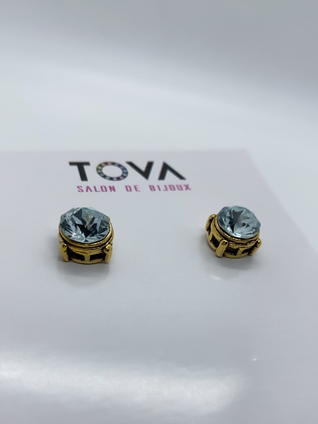 Pantallas dormilonas (studs) de la línea Tova. Material: Gold plated, Brass y Swarovski con terminación en patina.