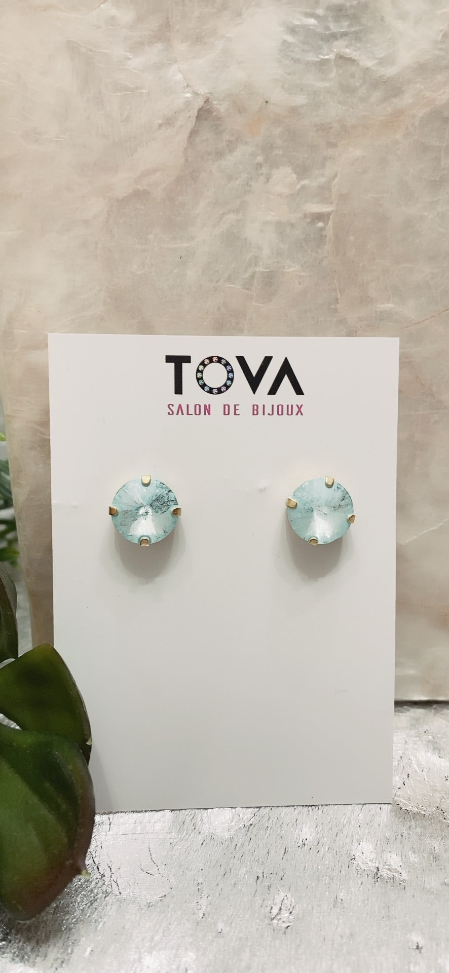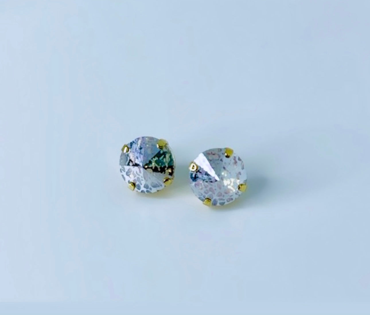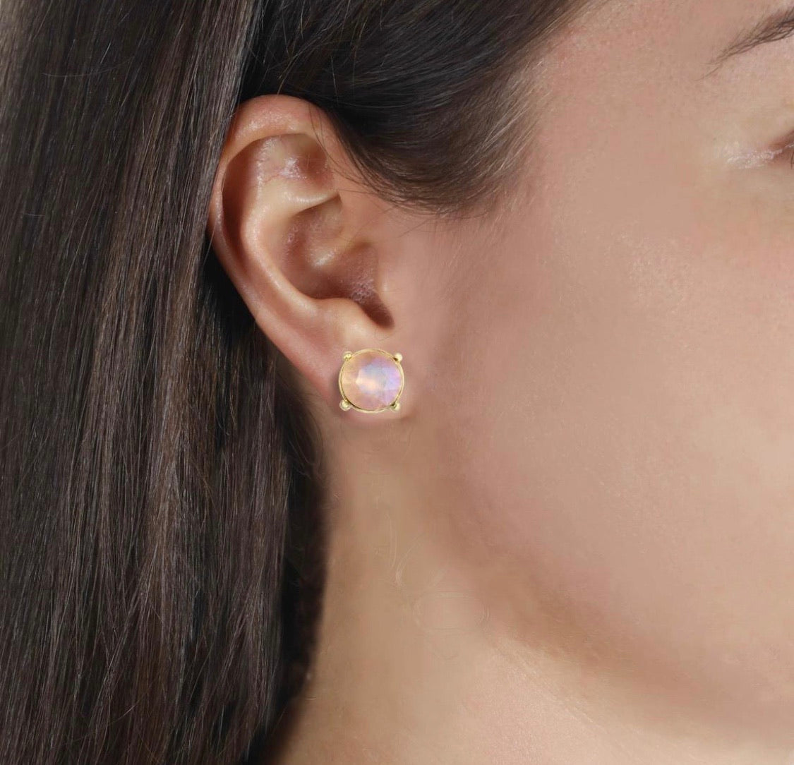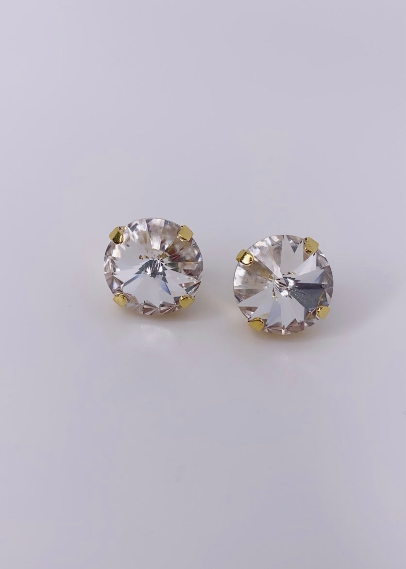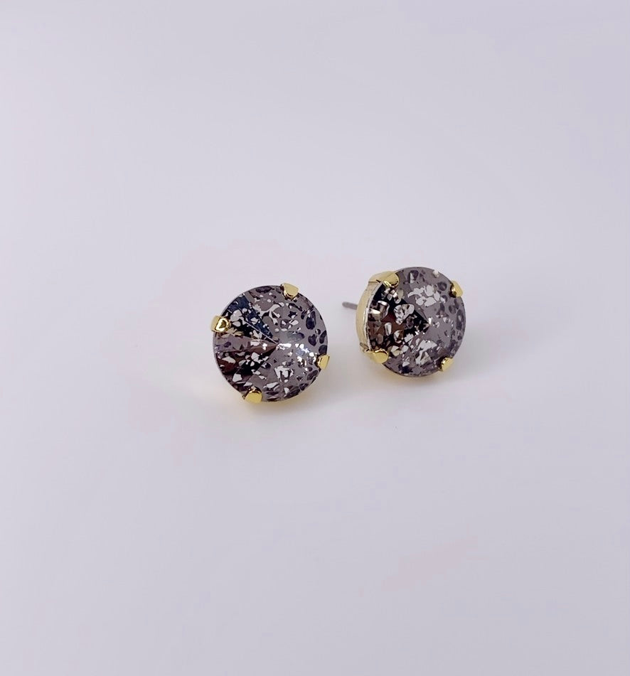 Pantallas dormilonas (studs) de la línea Tova. Material: Gold plated, Brass y Swarovski con terminación en patina.