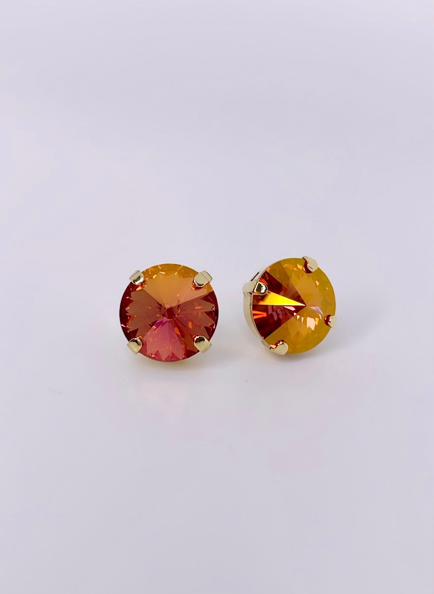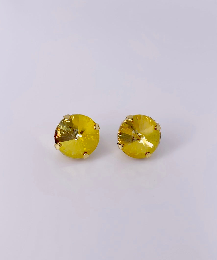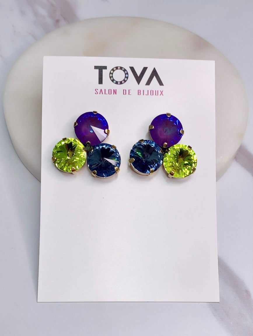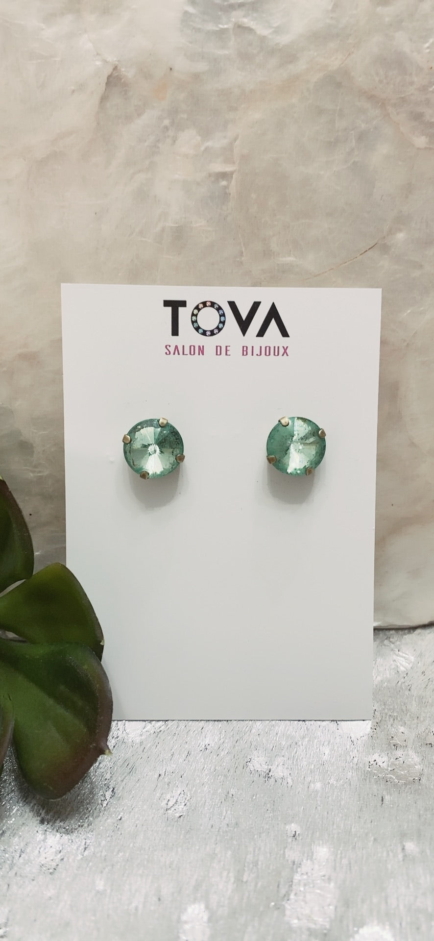 Pantallas dormilonas (studs) de la línea Tova. Material: Gold plated, Brass y Swarovski con terminación en patina.
