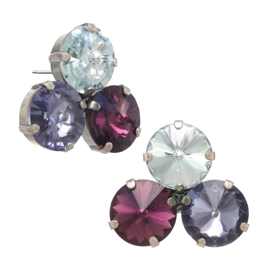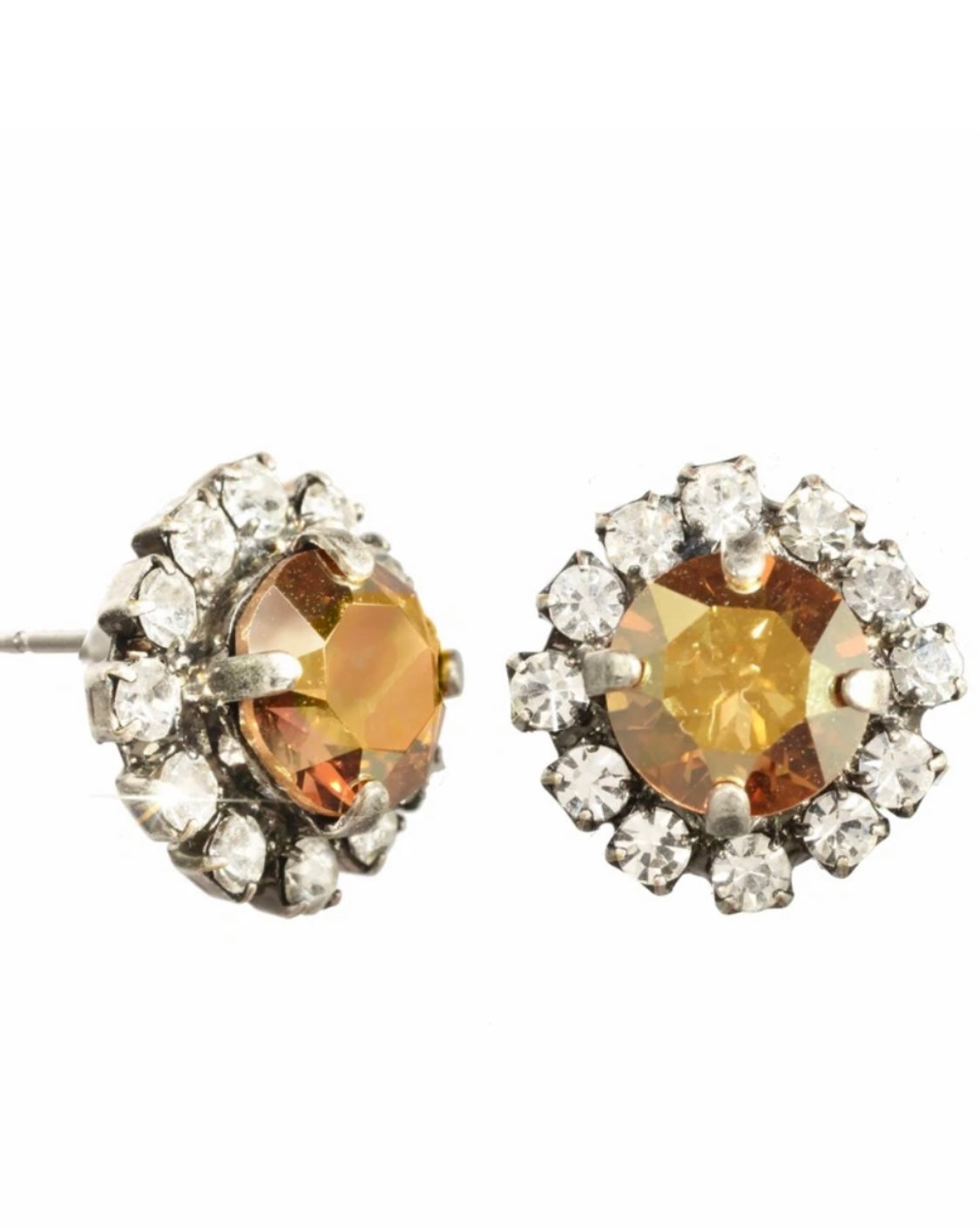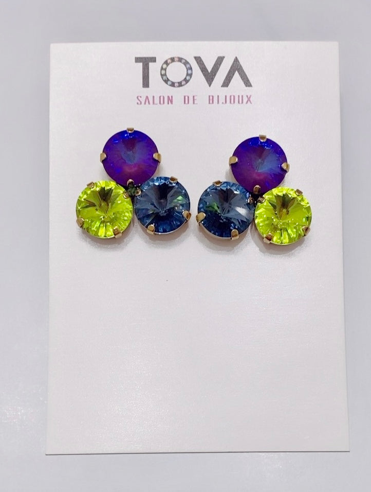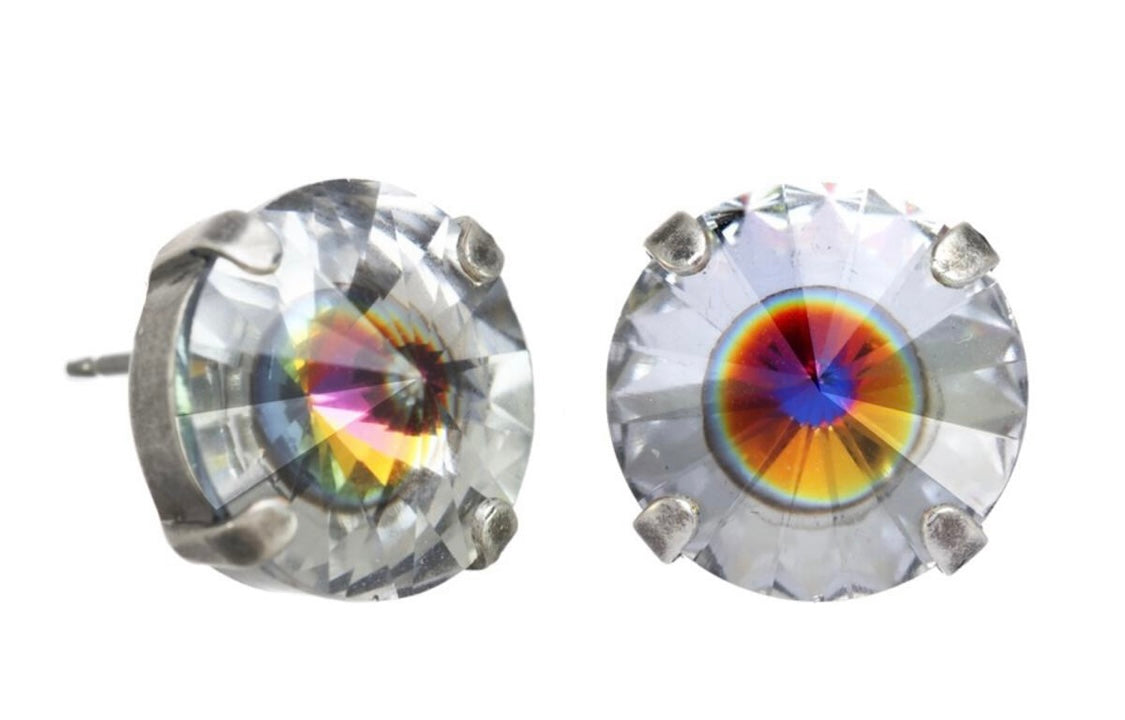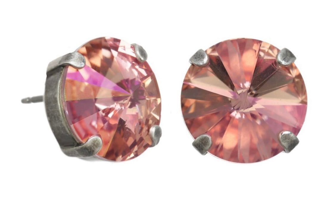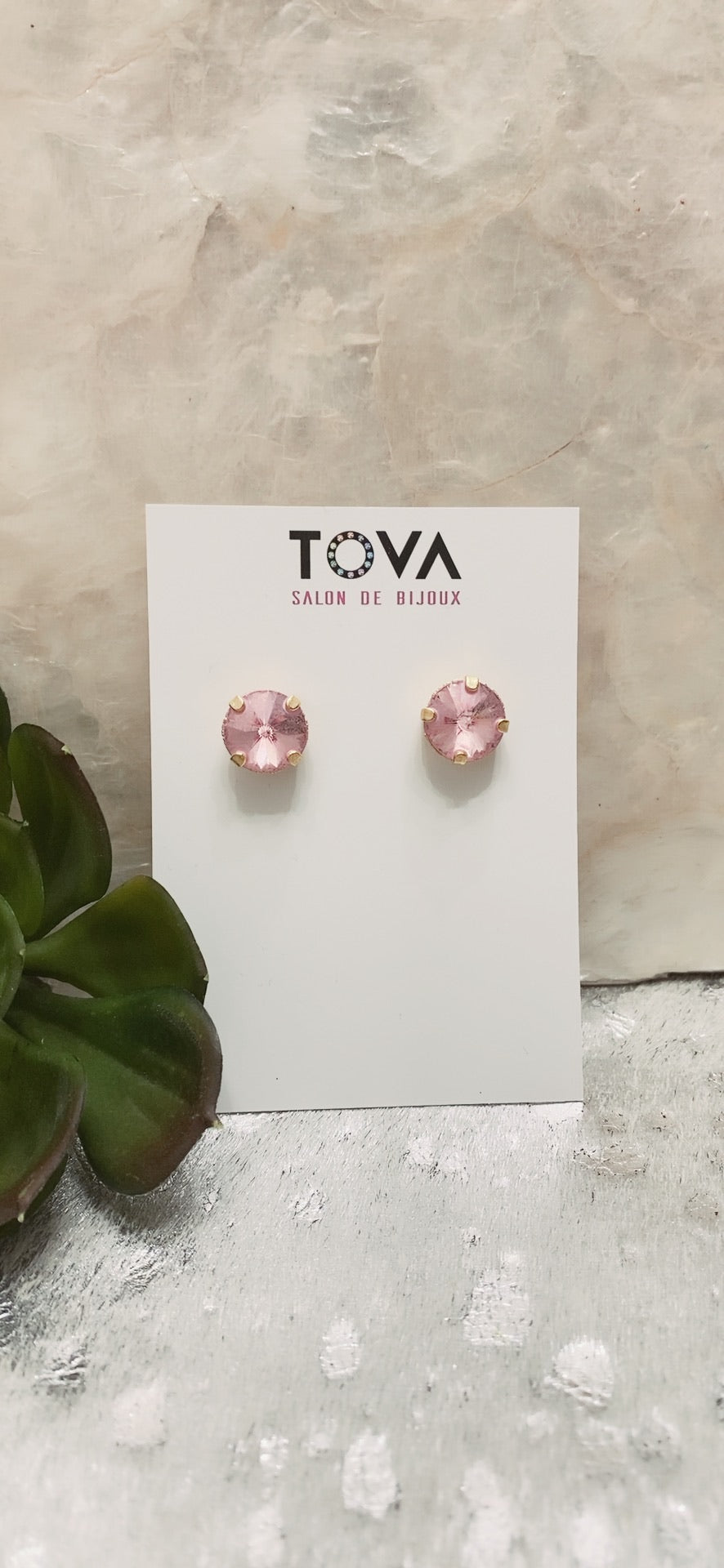 Pantallas dormilonas (studs) de la línea Tova. Material: Gold plated, Brass y Swarovski con terminación en patina.