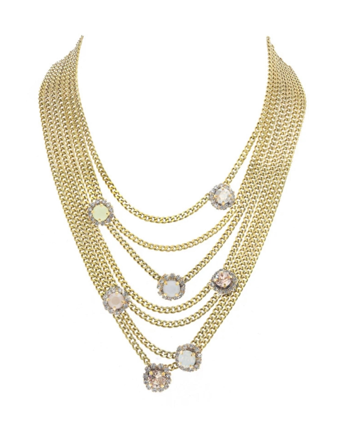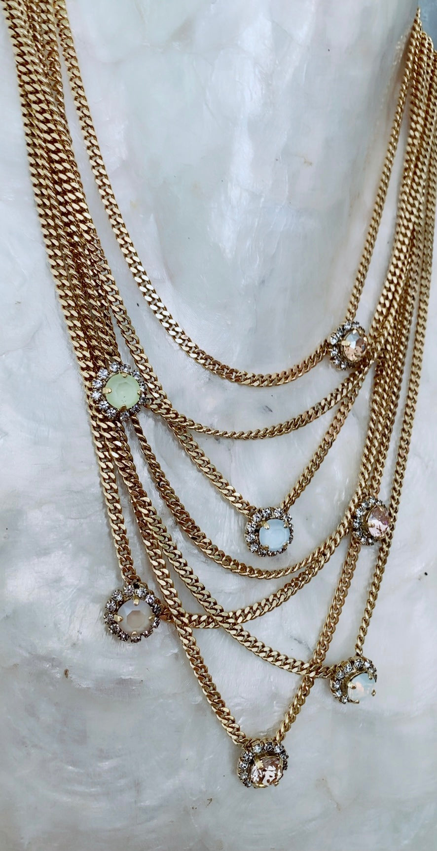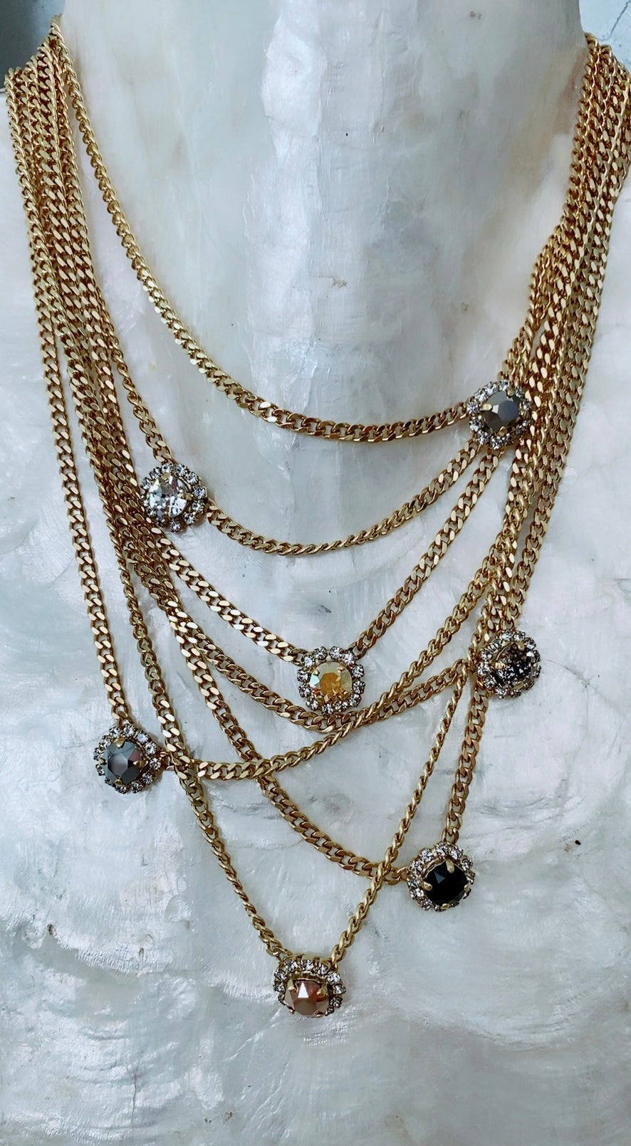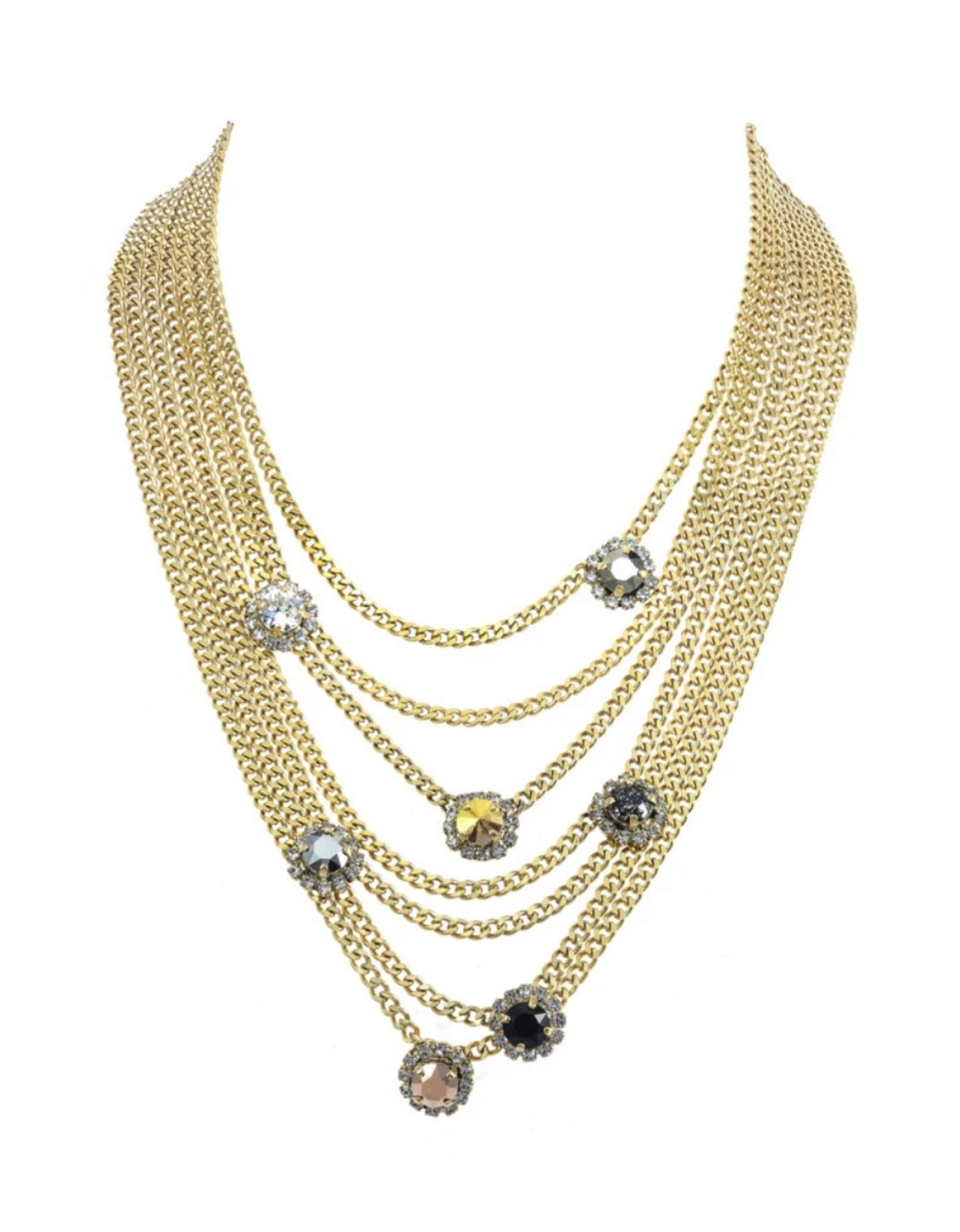 Cadenas en layers con Swarovski ki en diferentes colores. Antique gold plated and brass.